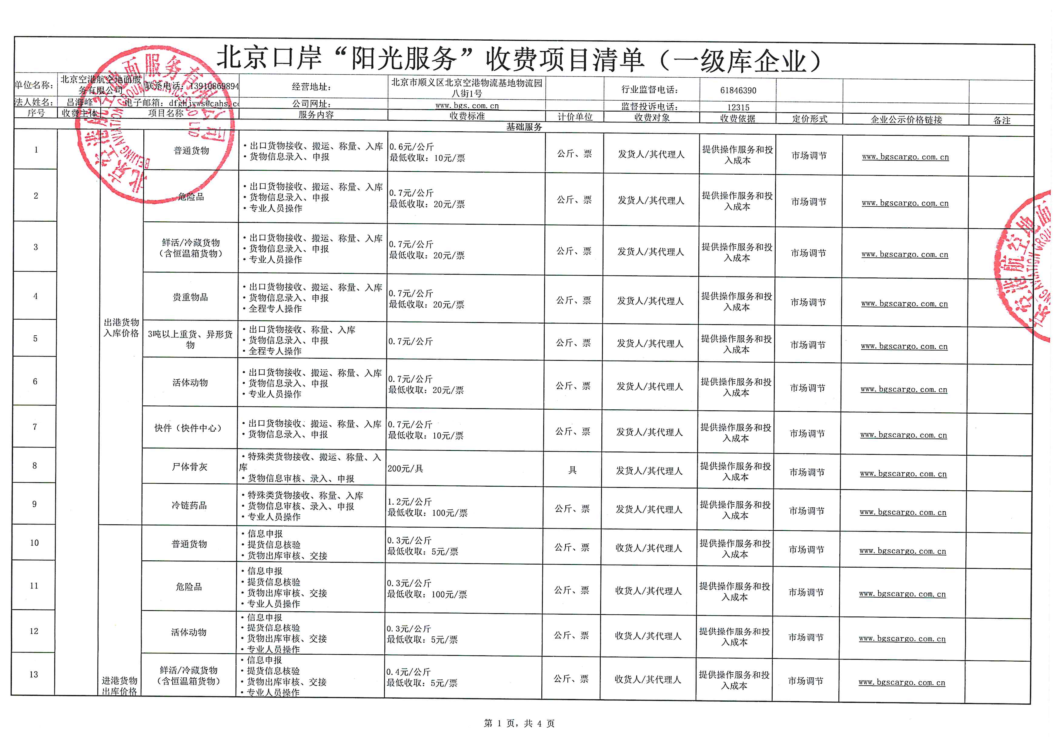 北京口岸“阳光服务”收费项目清单(地服公司)